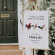 Cute farm theme birthday party welcome sign featuring watercolor illustration of chickens and a chick. The text says "cluck, cluck! join the flock!"