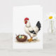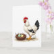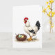 This card shows a white barnyard bird standing tall on a bright white background, with black accents on its wings and tail and a red comb that draws the eye. Its yellow beak and golden legs feel steady and grounded, while the small, attentive eye gives it a gentle, friendly look, as if it’s quietly keeping watch. To the left sits a twiggy nest that leans slightly toward the bird, creating a cozy, companionable closeness like two friends sharing a calm moment 🐰. Three decorated eggs rest inside, each white with neat stripes in green, yellow, and blue that add a spring touch 🌷. A short Easter greeting appears near the top in a soft, dark tone, centered so it floats above the scene without crowding it. Underneath, a few light earthy marks and tiny sprigs of plant life sit near the bird’s feet, hinting at a sunny patch of ground. The nest is drawn with thin brown lines, and the eggs’ colored bands wrap around them in tidy, even rings.