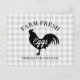 Chicken silhouette in center with "eggs" text overlay on gray and white gingham plaid background. Additional text: "Farm fresh, free range, organic". Great home decor piece for farmhouse, country and rustic themes.
