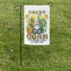 Flag bracket is super easy to assemble. There is a prong fork that goes into the ground. I dug a shallow hole to bury the prongs and still had enough height. Reinforced stitching on for the flag opening. Colors are true to the website. Mona Lisa's sign with the text is easy to read, the text is clear and not blurry.