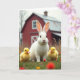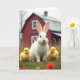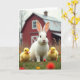 Designed with a sweet barnyard scene, the card centers on a fluffy white rabbit 🐰 sitting on fresh green grass, its tall ears lightly tinted pink and its small nose a soft rose shade. Two tiny yellow ducklings nestle close on either side, their round bodies angled inward as if sharing a quiet, friendly moment with the rabbit. Behind them, a red barn with white trim sits slightly out of focus, giving the foreground a cozy, intimate feel. The lighting is gentle and diffused, bringing out the soft texture of fur and down while keeping the scene calm and tender. A short greeting is placed near the top in a light, spring-toned color, with smaller text set neatly beneath it in a darker shade for contrast 🌷. Little wildflowers dot the grass around their feet, with red and yellow blooms repeating the barn and duckling colors. The rabbit’s dark eyes and fine whiskers stand out against its white coat, while the ducklings’ orange beaks add small warm accents near the center.