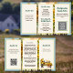 Rural homestead small business brochure to customize on both sides and fold into thirds. The background is sunflowers and a picket fence. Text is green for the headings and dark brown for the rest. Each side of this 5x8 size paper has three sections with text templates. Also add a logo, QR code, and / or photo in the spaces provided. If you don’t want to use one or more of the image holders, remove it by going to the “edit in design tool” which can be found by scrolling to the bottom of the personalize area. In the design area choose the image by clicking on it, then hit the “trash can” symbol for that image. Changing the size of the paper may alter the design to not fit correctly. Contact me if you’d like some help.