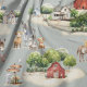 Farm themed fabric for sewing and crafts. A large scale pattern of farm houses, red barns, trees and animals, with a gray-blue background covers the material of your choice. Perfect for a baby or child's bedroom.