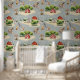 Farm themed pattern wallpaper for a child's room. Farmhouse, red barn, trees, and animals make up the fun pattern that repeats in a large print. The background color is gray-blue but the pattern will delight all children. Decorate one wall or all.