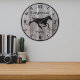 Personalize this custom barnwood styled clock with your farm, ranch, or stable name to add a personal touch to the decor. Barnwood look clock face with galloping horse silhouette in center. Choose one of two sizes and two colors of clock hand, whichever is to your liking.