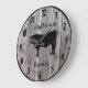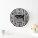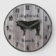 Personalize this custom barnwood styled clock with your farm, ranch, or stable name to add a personal touch to the decor. Perfect for the rodeo or livestock barn. Barnwood look clock face with beef bull cow silhouette in center. Choose one of two sizes and two colors of clock hand, whichever is to your liking.
