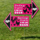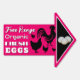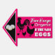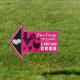 Farm fresh eggs farm stand, or farmer's market sign. Arrow shaped, double-sided, bright red-pink sign, with bold white text. Rooster and chickens silhouettes in black and arrow with eggs image. Customize the various fonts line by line with your advertising message. Sample wording is, "Free range, organic, fresh, eggs". Pay a little extra and get the wire stand with the sign.