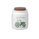 A candy jar with an illustration of a green and gray farm tractor in cartoon style! A nice idea for a gift to a farmer or a countryside family!
