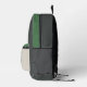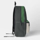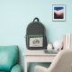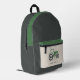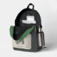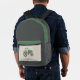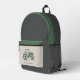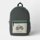 A backpack with an illustration of a green and gray farm tractor in cartoon style and a customizable text: perfect to make a gift to a farmer or a kid.