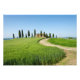Photo print of a curvy road through the grain crops towards a farm villa with a row of cypress trees in front of it near Pienza in Val d'Orcia valley in Tuscany, Italy.