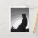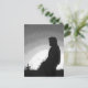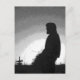 This striking fine art black and white postcard features the sun setting on a farmer in his field. He is holding a bale of hay. An evergreen tree is way back on the horizon. The original photography has been digitally enhanced to create an artistic effect.