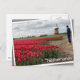 Postcard of a farmer wearing yellow wooden shoes inspecting his red tulips with in the background a traditional windmill in spring in the flower Bulb Region in the Netherlands with a white edge and the text 'Netherlands'. The card is a bit rotated to create the illusion of it laying loose.