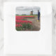 Photo sticker with a farmer wearing yellow wooden shoes inspecting his red tulips with in the background a traditional windmill in spring in the flower Bulb Region in the Netherlands.
