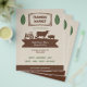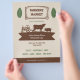 A vintage-style & rustic flyer for a farmers' market, all in beige, brown and green colors. It comes with leaves and a silhouette illustration including a tractor, a cow, a pig and a chicken.