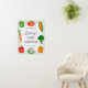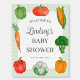 A cute farmers market green baby shower welcome sign foam board. Design features hand painted watercolor vegetables on a pastel green gingham background.