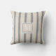 Custom modern farmhouse throw pillow featuring your monogram and family name on a beige and blue farmhouse ticking stripe.