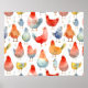 Cute and happy farmhouse chickens, cozy, colorful and rustic style drawing.