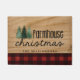 Farmhouse Christmas Country Plaid Family Name Wood- What a lovely way to welcome your guests to your home this holiday season. Doormat features "farmhouse christmas" in handwritten style lettering with 3 evergreen pine trees with red buffalo plaid accents. Doormat is personalized with your family name. Our doormat template makes it easy to personalize your doormat.