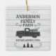 Farmhouse Christmas Tree Family Farm Personalized Ceramic Ornament. Beautiful rustic farmhouse christmas home decor. An old vintage truck hauling and christmas tree adorns this cute holiday design. Accented with pine tree branches, christmas trees, and holiday typography. Personalize this custom design with your family name and year established.