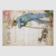 Country rustic illustration of a farmer and his dog. Farmer is wearing a tan straw hat and blue clothing, and is leaning on a walking stick. Dog is laying down and has brown and white fur. There are floral pink rose accent in top right corner and vintage french post stamps. Perfect for a rustic farmhouse or french country vibe, especially doing decoupage crafts.
