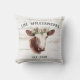 Farmhouse Highland Cow Family Name Throw Pillow - pillow features a Highland cow with a flower crown on a rustic wood background. Add a touch of farmhouse country to any room. Shown with white wood background. Also available in dark wood.