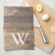 Simple and rustic light barn wood planks design with a white monogram letter at the bottom corner of the kitchen towel.