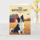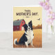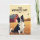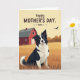 This card shows a black-and-white companion animal sitting quietly in tall, golden grass, looking slightly upward with amber eyes that feel devoted and close, like it’s waiting for a familiar voice ❤️. Its pointed ears and fluffy white chest stand out against the darker coat, and a white stripe on its face draws your gaze right to its gentle expression. On the left in the middle distance, a red barn with a gray roof adds a cozy rural touch, while on the right a line of trees in warm browns and oranges softens the horizon. Across the top, the message “happy MOTHER’S DAY. • MOM! •” is set in dark lettering, with “MOTHER’S DAY” in larger uppercase and the smaller words spaced around it. The sky fades from pale yellow to soft peach, giving the scene a tender glow that pairs well with a note of affection 🌼. A single bird silhouette curves through the upper-right portion of the sky. The grasses ripple in sweeping strokes around the animal, with the barn anchored low on the left and the trees clustered low on the right.