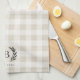 On-trend farmhouse style monogrammed kitchen towels feature your single initial monogram and year established in classic lettering with laurel leaf accents, on a tonal buffalo plaid background in chic neutral colors.
