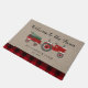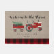 Farmhouse Red Plaid Personalized Monogrammed Doormat - a country welcome mat featuring a red antique farm tractor carrying a freshly cut Christmas tree and gift. Script typography reads - Welcome to the Farm and is personalized with family name and year established.