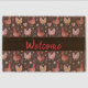 A black background decorated with a retro farmhouse style rooster and hen pattern in red, pink. Sample text: welcome