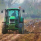 Preparing for the next crop. The tractor plows (ploughs) the field and wild birds look for food in the freshly turned soil. Watercolor England.