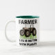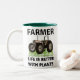Farming Tractor Field Farmer Two-Tone Coffee Mug designed by Nisha Prabhu. Featuring original digital design illustration of tractor on wheat field with typography ''Farmer. Life Is Better With Plants.'' Sip in style with this Farming Tractor Field Farmer Two-Tone Coffee Mug! Embrace the rural charm as you enjoy your favorite brew in this delightful mug featuring a picturesque design of a tractor in the field. Whether you're a farmer at heart or simply appreciate the beauty of farm life, this mug is sure to brighten your day. With its two-tone design and sturdy ceramic construction, this mug is both stylish and functional. Perfect for your morning coffee or tea, this mug is a wonderful addition to your kitchen collection. Order now and elevate your coffee breaks with a touch of agricultural flair!