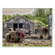 An unusual fun abstract design of the farm with barns, cows, horse and equipment.