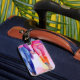 This luggage tag has fashion art on them.