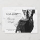 Stylish photographs of women front these invitation cards. A black and white photograph of a woman in a corset and lace-trimmed skirt on one side, and on the other, a wide hat and red dress worn by the model holding a wineglass.