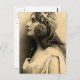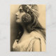 Vintage photo of a young woman shown in profile. She's got a metal hat with a star like decoration on the side and a large round decorated piece hanging down over the ear