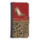 Fashionable animal print wallet style iPhone 5 case, with graphics of a brown and black jaguar fur pattern background, on the bottom half and a solid dark red, on the top of the case. Graphics of a jaguar animal print pair of stiletto high heels and a tan ribbon, decorates the case. Personalize the black text for yourself or as a lovely gift idea to your favorite Fashionista.