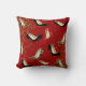 Lovely two look decorator throw pillow, with a fun graphic print of fashionable stiletto high heels against a deep red background, with gold tone flourishes, on the front. The back of the pillow is done in a spotted brown and black jaguar print on one side, with graphics of a red and gold tone ribbon stretching across the middle, with a big elegant red bow. Pretty pillow for any room of the house and makes a great gift idea to any designer shoe hound.