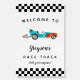 Fun race car theme boy's birthday party welcome sign featuring illustration of a blue fast car with flame art on the side. The text says "welcome to XX's race track."