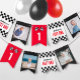 This bunting banner features a red, black and white race car themed design for a 1 year old, with the popular saying "fast one". Personalize it by adding custom photos along with your Child's name and age. A fun, colorful banner, perfect for a race car themed birthday party!