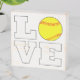 Fastpitch Softball LOVE Home / Office Sports Decor Wooden Box Sign: A simple and beautiful wooden box sign for fastpitch softball players and coaches to display at home in the bedroom or in the coach's office. Featuring a unique square design with LOVE printed in bold white letters and a bright yellow softball in place of the O!