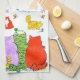 A whimsical view of fat cats forms the overall pattern for this colorful kitchen towel.