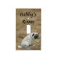 Adorable light switch with a cute fat pug sitting on the bottom of the switch plate and the dog's name at the top. You can personalize the text to whatever you would like.