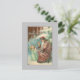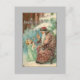 Brown-robed old world Father Christmas sitting in snow-covered woods with kneeling angel. Background color is editable. Back features custom complementary graphics with editable text fields.