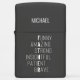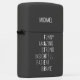 Modern dad stylish zippo lighter with a crossword puzzle style of words that define a father and a custom name. "Father" is hidden in these loving words of appreciation: Funny. Amazing, Strong, Insightful, Patient and Brave. Solid black lighter with simple white, minimalist typography. A great birthday gift for the best dad ever!