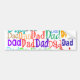 This bumper sticker has the word “Dad” repeated in different fonts and different colors across the whole design. Fun and bright.