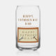 This awesome can glass features a digital art image of a wooden desk with a group of wooden letters on it that spell out the words Happy Fathers Day. Each of the letters has a series of nails hammered into it. There is also a spanner on one side of the sign and a hammer on the other side. A great design for any handyman Dad who loves to make things. There is custom text so you can include a message of your choice.