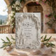 This design features a highly detailed, monochromatic illustration evocative of a grand gothic cathedral. The layout is framed by an ornate architectural border with baroque scrollwork and cascading floral garlands in soft shades of ivory, cream, and beige. Two symmetrical doves rest atop a stone balustrade arch, creating a sense of peace and symmetry. The text is presented in a mix of elegant flowing calligraphy and refined serif typography. This is a flat printed image with a Faux 3D Embossed Relief effect, not actual raised paper or pressed material.