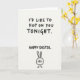 This card features an off-white background that looks like textured art paper, leaving lots of open space around the design. Across the upper portion, large charcoal lettering reads “I’D LIKE TO HOP ON YOU TONIGHT,” with rounded, marker-like strokes that feel like a flirty note passed between close friends. Just below, a smaller line in the same charcoal color says “HAPPY EASTER,” centered beneath the main phrase and adding a cheeky contrast 🐰. The layout keeps the words stacked and easy to read, with the top line taking up most of the visual weight. Near the bottom sits a simple bunny-like character with an oval body, two long upright ears, and short legs, as if it’s standing shyly under the message 🐇. Its face is minimal—dot eyes and a tiny curved mouth—giving it a sweet, slightly bashful look that softens the teasing text. The bunny is drawn in the same dark tone, positioned low and centered with plenty of blank space surrounding it.