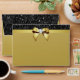 Elegant custom black and gold envelopes with a beautiful glittery black printed image sequins jewels, gems, glitter pattern, cute, sophisticated shiny printed golden bow and ribbon and pretty digital diamond bling jewel on a gold gradient background. Please note: These are flat printed graphics - not real bow, diamond or sequins. These classy glamorous envelopes are decorated inside and out. Beautiful, stylish, chic, trendy, modern, glitz and glamour envelopes. If you need assistance customizing your product please contact me through my store. I will be happy to help.